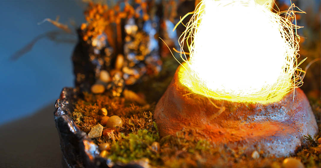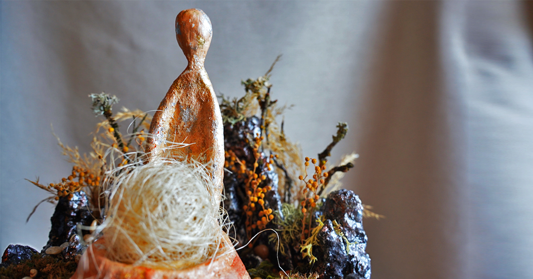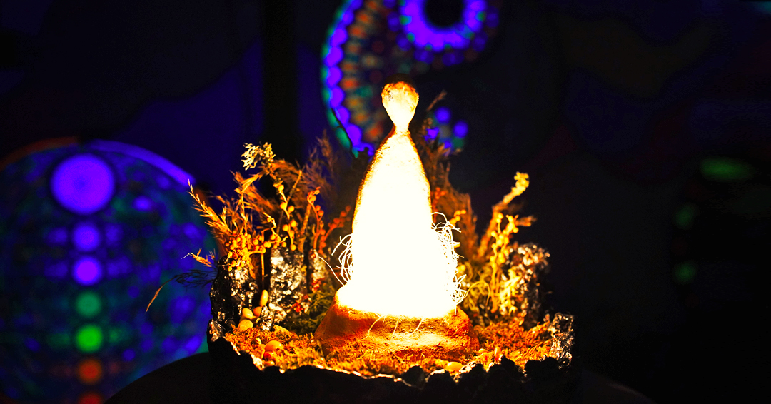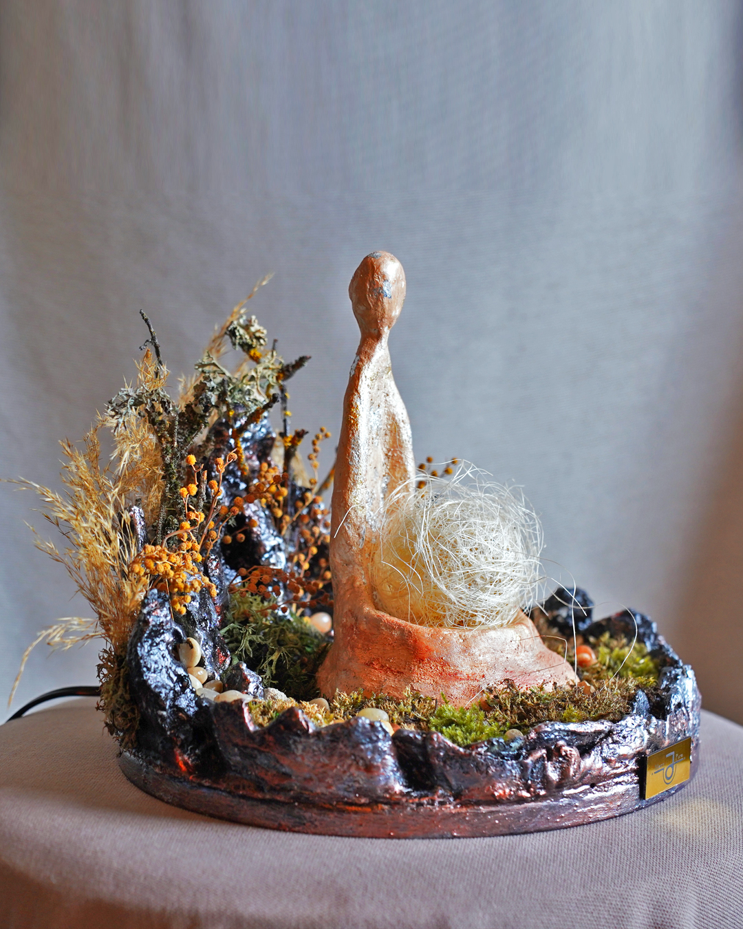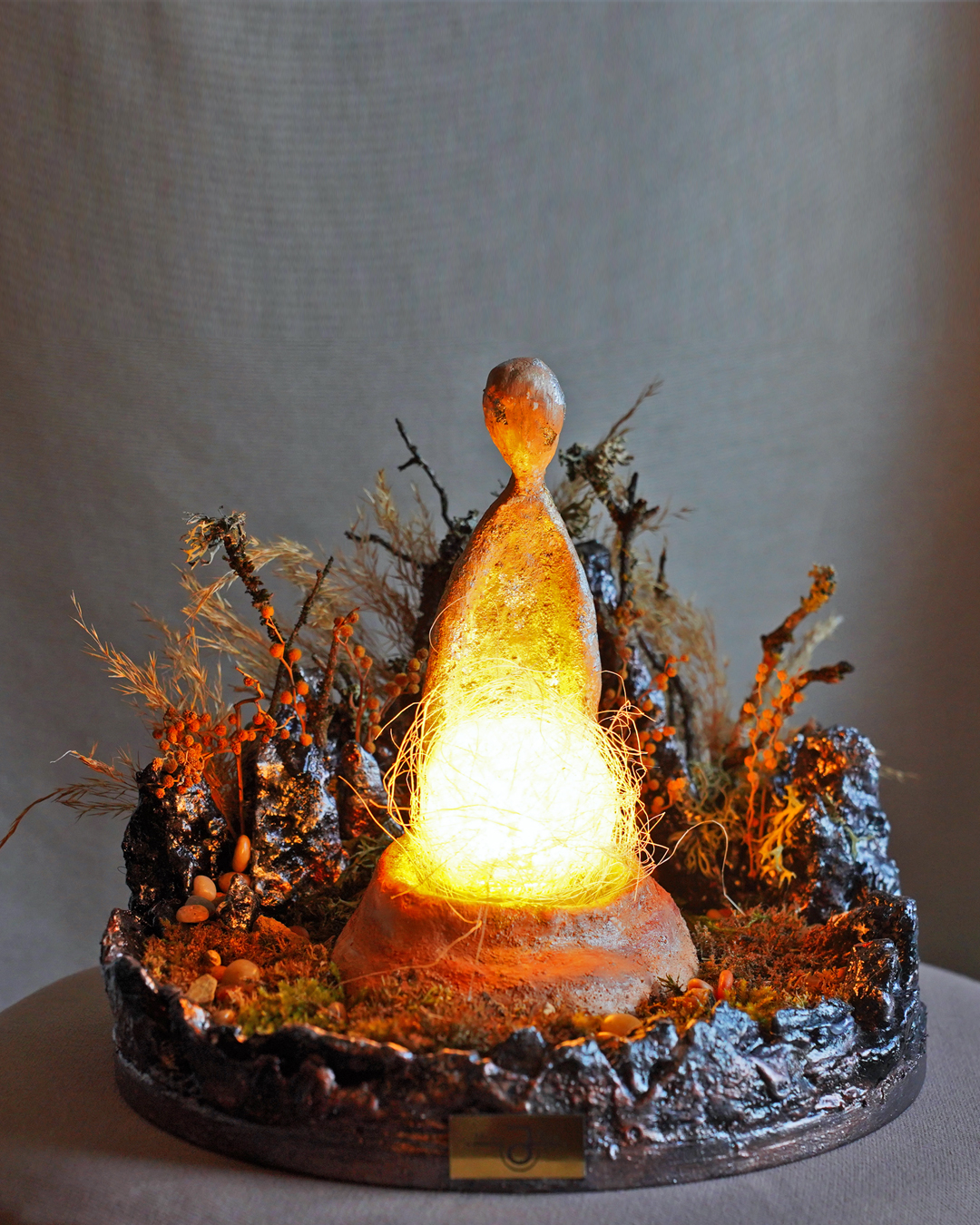 The centerpiece of this handmade lamp is a handcrafted figure created from Papier-Mâché and plaster, which radiates a soft, warm light from within. Nestled on a base of lush stabilized moss and dried botanicals, the composition captures the essence of a quiet forest retreat.
