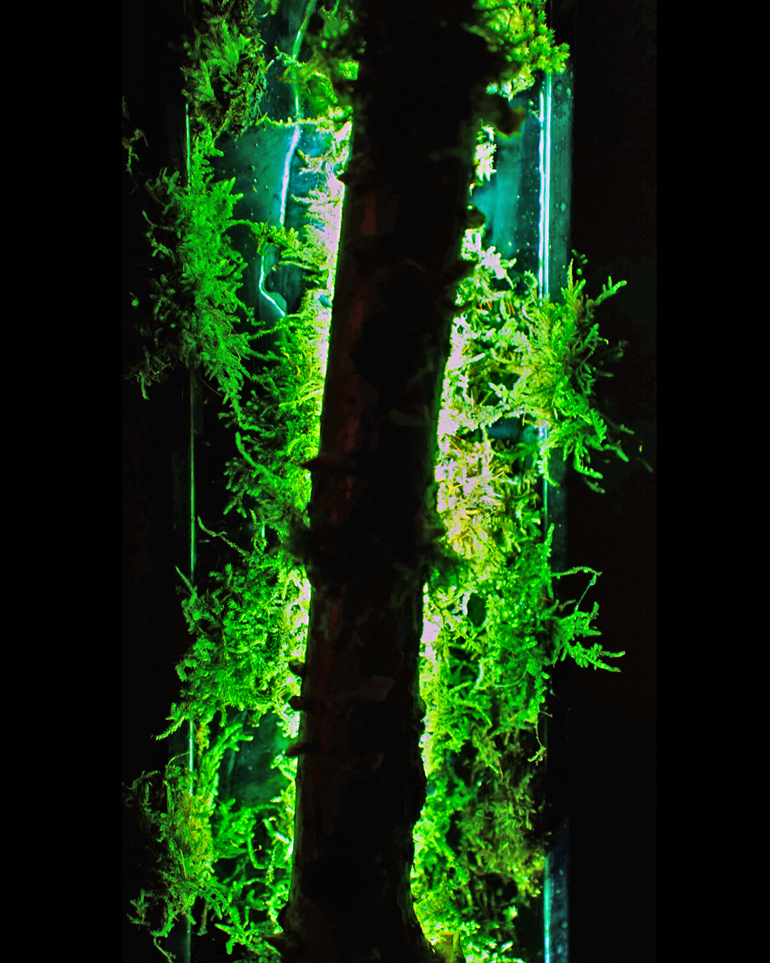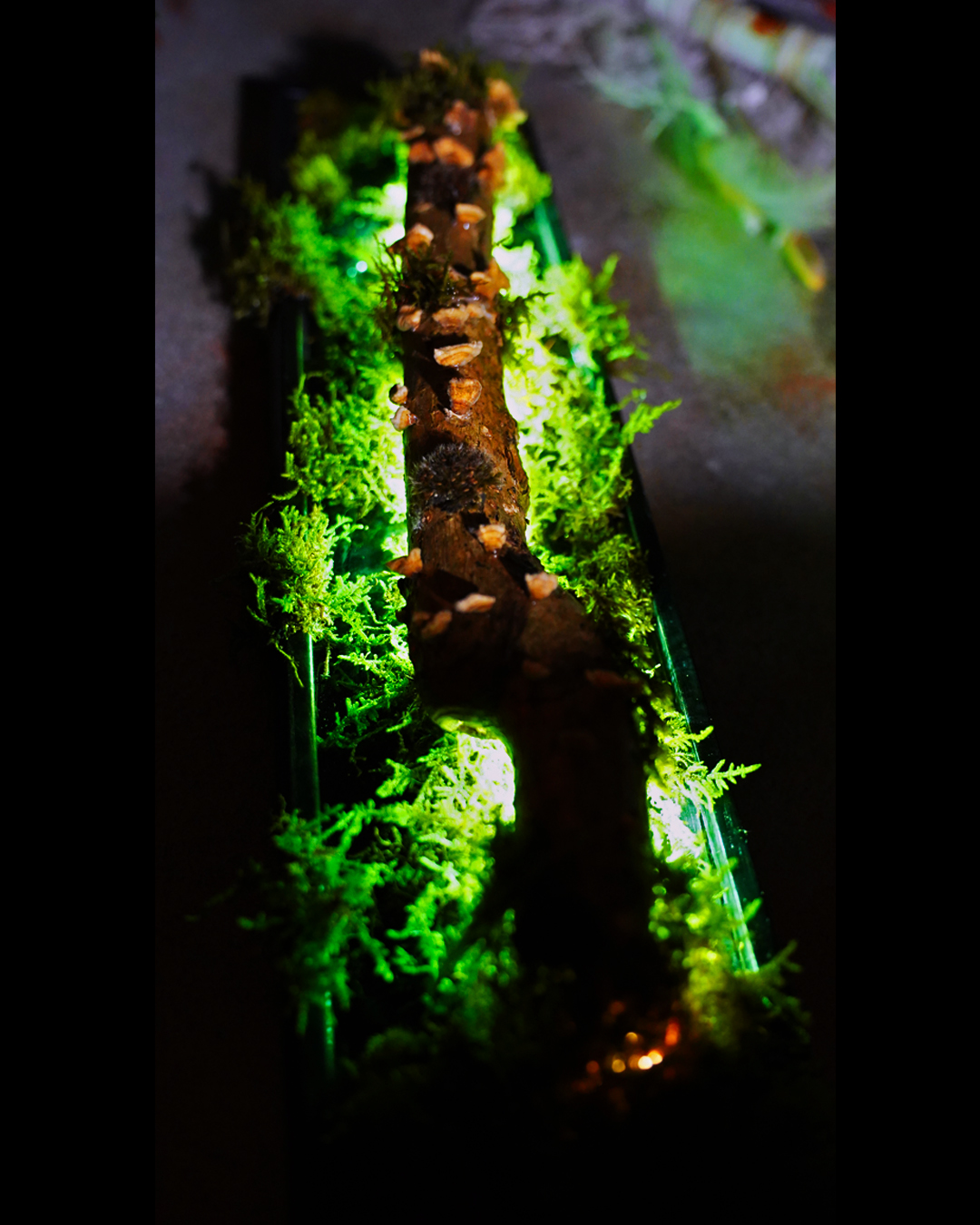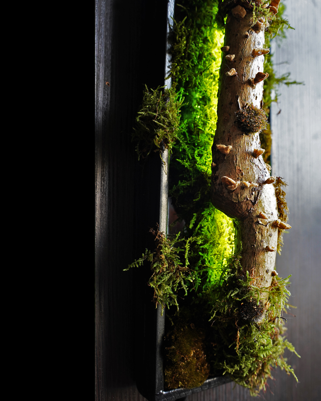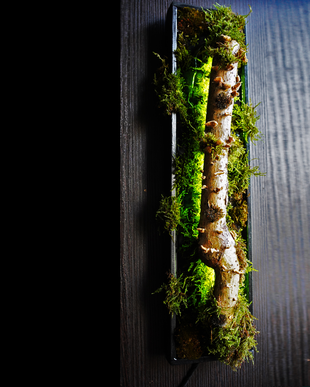 The integrated LED strip provides a soft, warm glow that highlights the organic textures of the wood and the vibrant green of the moss.