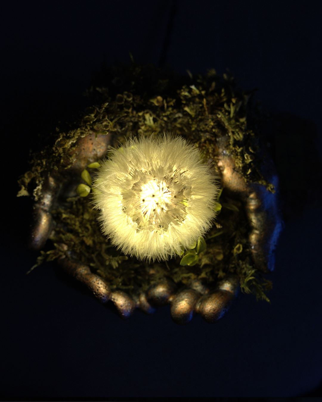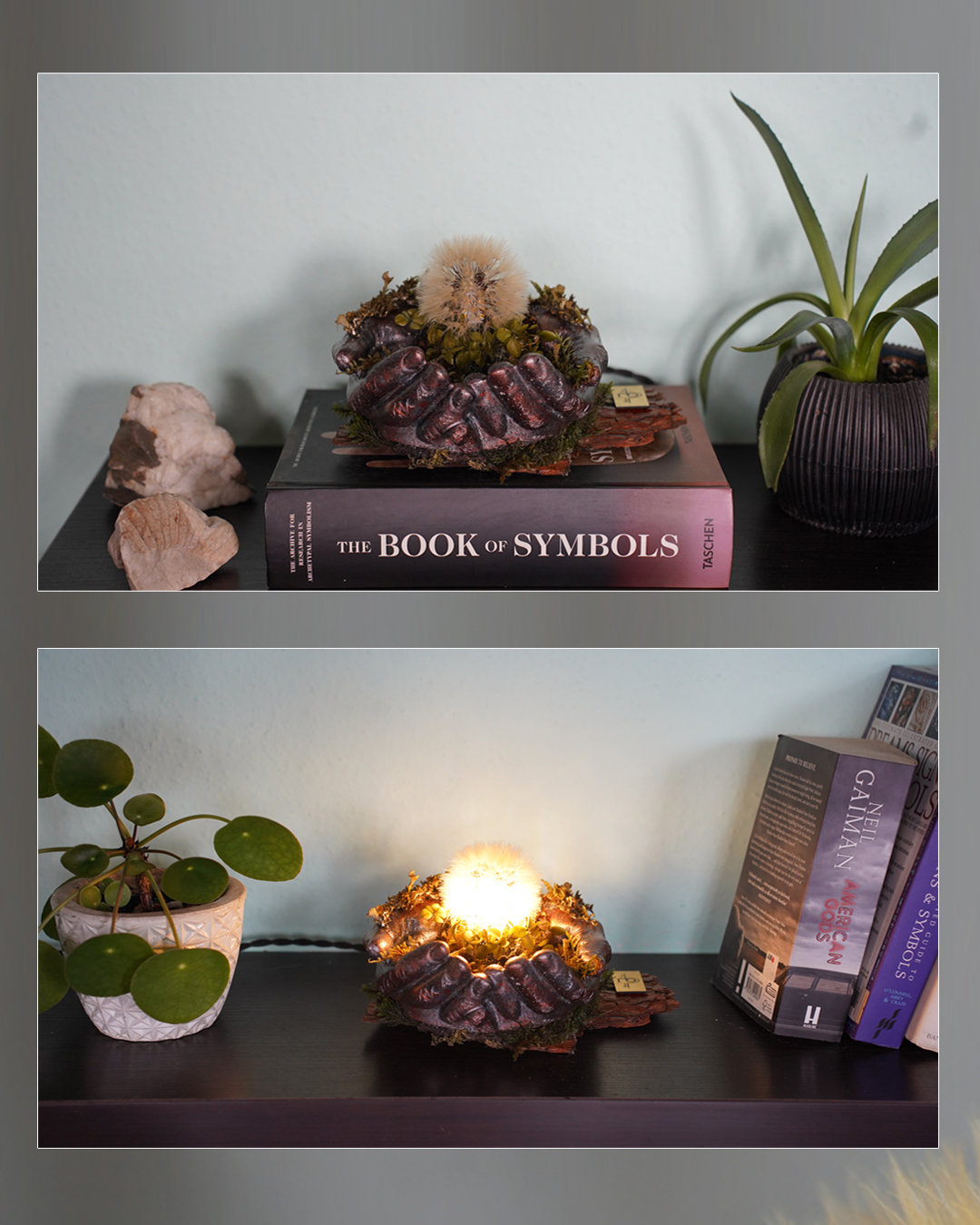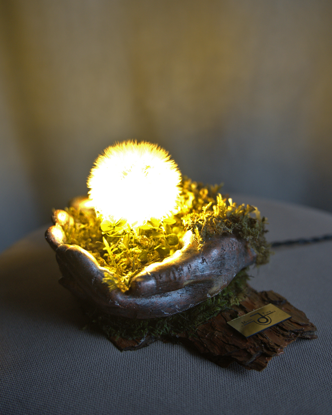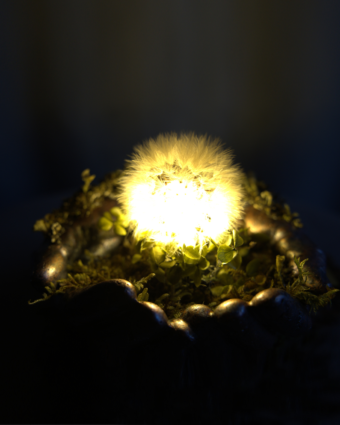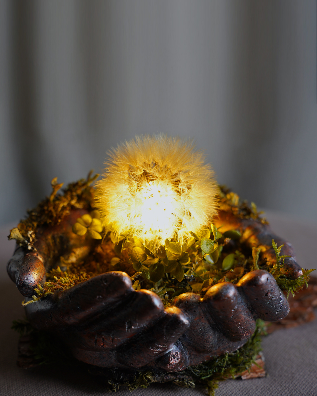 ნამდვილ ბაბუაწვერას ბუსუსებში მოთავსებული შუქი ქმნის ნაზ, მშვიდ ატმოსფეროს. ხელის ფორმის ელემენტები თითქოს ფრთხილად ინახავს ამ სინათლეს, ხოლო მის გარშემო შექმნილი მინიმალისტური ბუნებრივი ლანდშაფტი სიცოცხლისა და სიმშვიდის განცდას აძლიერებს.